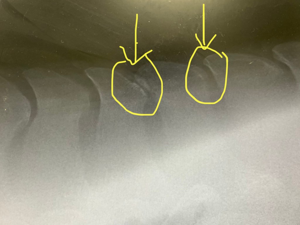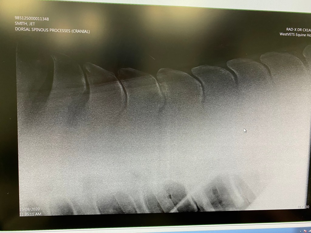 Theo- a horse I took on from a client due to him being overly anxious and throwing in the occasional buck was concerning me. Despite him being a lovely mover and scopey jumper he was so difficult to get him to relax his back, it felt as though he was a bomb about to go off, he would literally hold his breath until you walked. He would also disunite and bunny hop in the canter. I thought it was time to investigate the reason-> X-rays of his back revealed some kissing spines. We injected his back with some steroids as well as his hocks and waited to see whether there was much improvement.