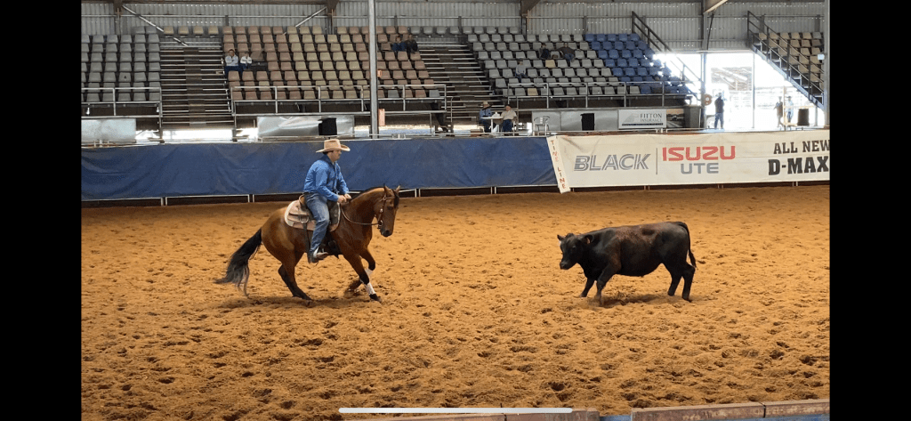 At the end of November I travelled with my partner Johnny to the Toowoomba Cutting Futurity. We went up to his trainers and stayed in the Caravan, which was a luxury and felt like a mini holibreak… it was fabulous watching all the quarter horses and riders work the cattle- in what is usually our eventing * classes indoor Dressage arena. I was itching to have a go and thankfully for me Johnny, who was a little unwell organised for me to lope for him. This effectively means working the horse down/ warming them up before their go. The riders often lope for hours. I would be on for 2 hours, walk, trotting and loping around in a 30m circle with all the others. Wishing they would change the rein. I initially was told off for not wearing a cowboy hat as I had on a cap, Johnny’s head is far bigger than mine so we had to bend back the inner band to hold it on, thankfully it worked. I have to say, Evermore, Johnny’s colt was far better schooled than everyone else’s by the time it had finished loping ha ha. John did brill and just missed the top 6 after his 3rd run didn’t go as well as the first two- its a little bit different when you’re not only riding an animal but also moving around a second.